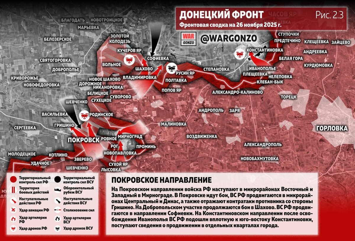 На Покровском направлении войска РФ наступают в микрорайонах Восточный и Западный в Мирнограде. В Покровске идут бои, ВС РФ продвигаются в микрорайонах Центральный и Динас, а также отражают контратаки противника со стороны Гришино. На Добропольском участке продолжаются бои в Шахово. ВС РФ продвигаются в направлении Софиевки. (Рис. 2.2) На Константиновском направлении после освобождения Иванополья ВС РФ подошли вплотную к юго-востоку Константиновки, поступают сведения о продвижении в отдельных кварталах города. На Краснолиманском направлении ВС РФ развивают наступление на Красный Лиман от Ямполя. Есть продвижение к Озёрному, а также к Закотному. В Северске войска РФ продвигаются как с южной, так и с северо-восточной стороны города. (Рис 2.3) Харьковский фронтНа Купянском участке ВС РФ закрепились в районе Соболевки, таким образом предотвратили контратаки на город с запада. Идут бои в районе станции Заосколье. (Рис. 3.1) На Волчанском участке бои в южной части Волчанска и в лесах к западу от Синельниково. (Рис. 3.2) Сумской фронтСообщается о столкновениях в районе Андреевки, Варачино. (Рис. 4) 27 км вглубь обороны ВСУ. ОСВОБОЖДЕНИЕ ВОЛЧАНСКА. Конец террористам фашистского Азова. Сводка 26/11Дальневосточный экспресс прибыл в Гуляйполе. В Киеве скрывают катастрофу. Никто не ждал удара с этого направления. Военные эксперты с удивлением отмечают: "дальневосточный экспресс" прибыл в Гуляйполе. Русские войска вошли на окраины, враг не может сопротивляться. Что происходило на фронтах СВО в течение суток и не попало в официальные сводки. Новороссийск опять атакованВторую ночь подряд в Новороссийске отражали атаку украинских дронов. Досталось и другим регионам России. "До полуночи 14 украинских дронов самолётного типа сбиты над Белгородской областью. По Чебоксарам (Чувашия, 980 км от границы) ранним утром была совершена атака украинскими БПЛА. По оценкам каналов противника, на которых расходится видео удара, целью был завод по производству товаров двойного назначения. Обломки украинского БПЛА влетели в жилую многоэтажку в Чебоксарах", – докладывают "Два майора". Наши в ответ били беспилотниками и ракетами по Харькову, Одесской и Днепропетровской областям, Запорожью.
