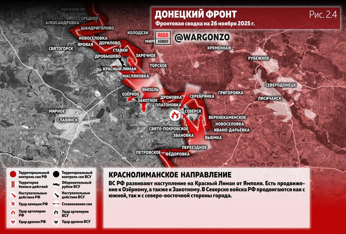 Новую информацию о ходе проведения ВС РФ специальной военной операции на 26 ноября предоставили представители группировок «Север», «Запад», «Центр», «Юг» «Днепр» и «Восток», ведущих военные действия на шести основных направлениях. Сводка Министерства обороны Российской Федерации о ходе проведения специальной военной операции на 26 ноября 2025 годаПодразделениями группировки войск «Север» нанесено поражение формированиям трех механизированных, егерской, десантно-штурмовой бригад ВСУ и бригады теробороны в районах населенных пунктов Могрица, Мирополье, Павловка, Алексеевка, Андреевка и Новая Сечь Сумской области. На Харьковском направлении нанесено поражение подразделениям двух механизированных, мотопехотной бригад, штурмового полка ВСУ и бригады нацгвардии в районах населенных пунктов Волчанск, Вильча, Уды, Хатнее и Старица Харьковской области. Противник потерял более 180 военнослужащих, три боевые бронированные машины, 15 автомобилей, 105-мм гаубицу М101 производства США и станцию радиоэлектронной борьбы. Уничтожены два склада боеприпасов и семь складов материальных средств. Подразделения группировки войск «Запад» улучшили тактическое положение. Нанесено поражение живой силе и технике пяти механизированных, штурмовой бригад ВСУ, двух бригад теробороны и бригады нацгвардии в районах населенных пунктов Моначиновка, Староверовка, Подолы, Нечволодовка, Благодатовка, Гусинка, Ковшаровка Харьковской области и Диброва Донецкой Народной Республики. Потери противника составили до 230 военнослужащих, боевая машина пехоты, бронетранспортер М113 производства США, две боевые бронированные машины, 20 автомобилей, три орудия полевой артиллерии, десять станций радиоэлектронной борьбы и шесть складов боеприпасов. Подразделения «Южной» группировки войск заняли более выгодные рубежи и позиции. Нанесено поражение формированиям трех механизированных, горно-штурмовой, аэромобильной, артиллерийской, штурмовой бригад ВСУ и бригады морской пехоты в районах населенных пунктов Северск, Резниковка, Платоновка, Славянск, Пискуновка, Константиновка и Бересток Донецкой Народной Республики. Противник потерял до 275 военнослужащих, боевую машину пехоты, бронеавтомобиль «Казак», 16 автомобилей и два артиллерийских орудия. Уничтожены радиолокационная станция контрбатарейной борьбы AN/TPQ-50 производства США, станция радиоэлектронной борьбы и склад боеприпасов. Подразделения группировки войск «Центр» улучшили положение по переднему краю. Нанесено поражение живой силе и технике двух механизированных, егерской, аэромобильной, десантно-штурмовой, штурмовой бригад, трех штурмовых полков ВСУ, двух бригад морской пехоты и трех бригад нацгвардии в районах населенных пунктов Торское, Родинское, Торецкое, Дорожное, Артемовка, Удачное Донецкой Народной Республики, Новопавловка и Ивановка Днепропетровской области. В населенном пункте Красноармейск Донецкой Народной Республики штурмовые группы 2-й армии успешно продвигаются в северном направлении в микрорайонах Центральный и Динас. Продолжают зачистку населенного пункта Ровное Донецкой Народной Республики. Отражены восемь атак подразделений 210-го штурмового полка и 95-й десантно-штурмовой бригады ВСУ из района населенного пункта Гришино Донецкой Народной Республики и в направлении населенно