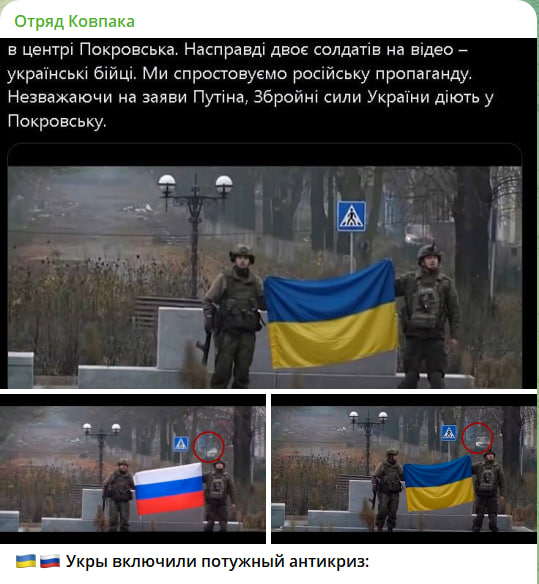 Киев тут же подключил все свои медийные ресурсы, чтобы опровергнуть информацию. "Перемога" продолжается уже неделю. Кроме заявления в через ручные СМИ и каналы-милионники, были подключены и те, кто уже не первый год пытается мимикрировать по русские каналы (на деле, полностью подконтрольные СБУ). После в сеть было вброшено видео с якобы боевиками нацбата "Скала" в центре Покровска, раскинувших свой "прапор" – ЦИПСО использовали нейросети, чтобы заменить на нашем видео флаг. А 6 декабря были слиты карты Генштаба ВСУ "из альтернативной реальности".